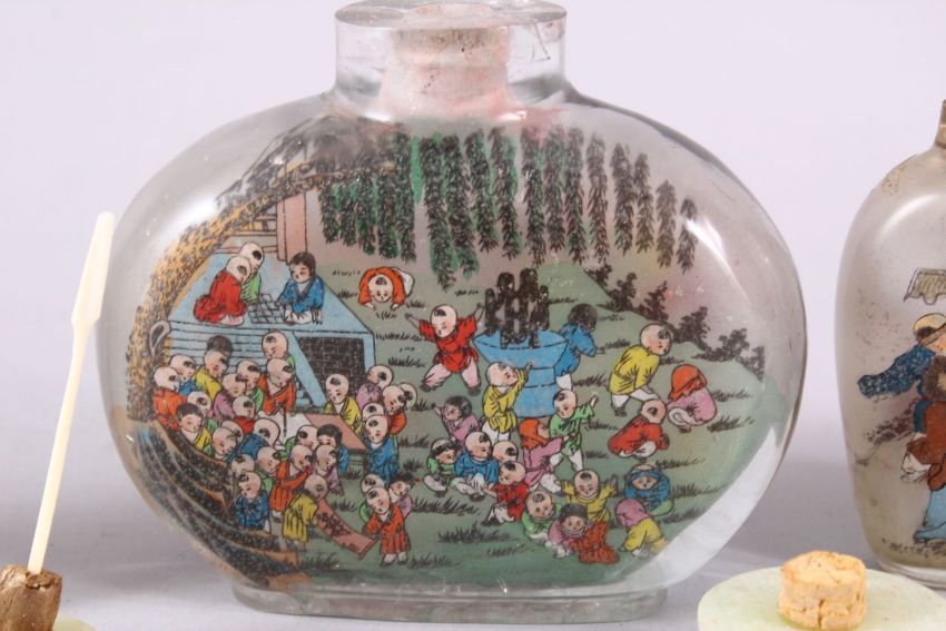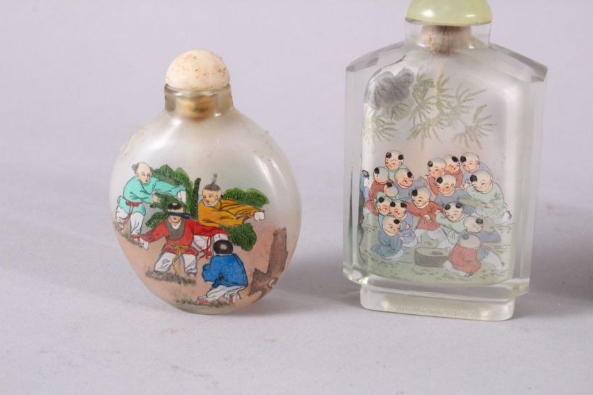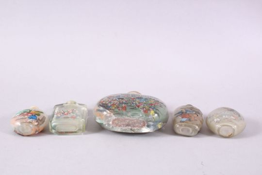 A MIXED LOT OF 5 CHINESE REVERSE PAINTED SNUFF BOTTLES, each with decoration of boys in landscapes, the largest 10.5cm high down to 6cm. (5)