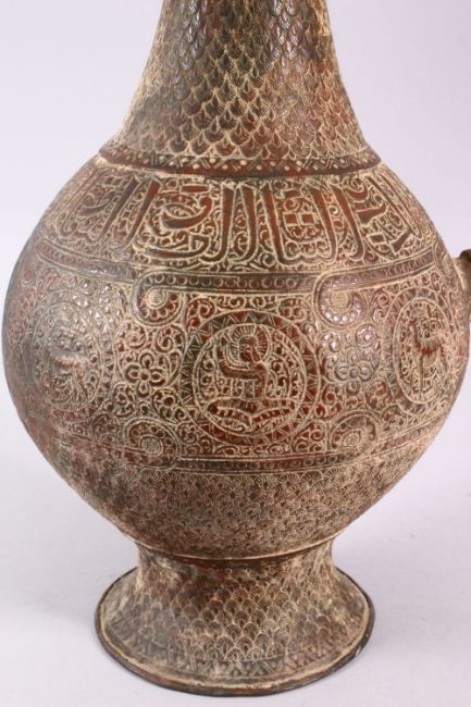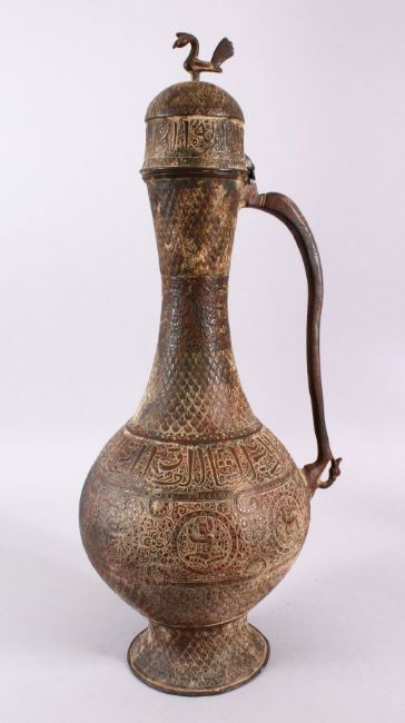 A RARE LARGE EARLY ISLAMIC POSSIBLY 13TH CENTURY SELJUK COPPER WATER FLAGON, depicting zodiac symbols amongst bands of calligraphy, body carved with peacock feather decoration, the lid with a bird, 58cm high x 26cm