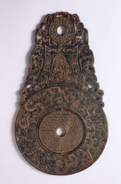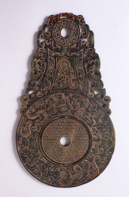 A CHINESE CARVED JADE BI DISK, carved with archaic style bats and chilong, 29cm x 16.5cm