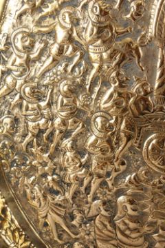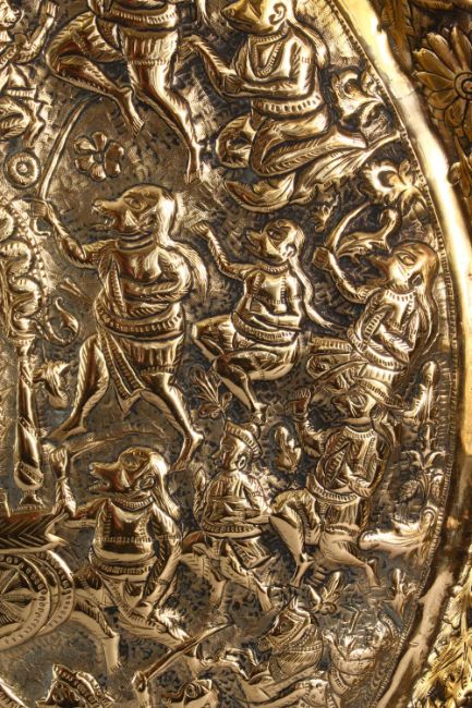 A 19TH CENTURY INDIAN EMBOSSED BRASS TRAY, with decoration depicting many scenes of figures and animals, with a floral borders, 73cm wide x 59cm deep.