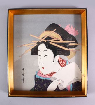 A JAPANESE WOODBLOCK PRINT OF A KABUKI ACTOR - KITAGAWA UTAMARO - depicting a posed kabuki actor in traditional gowns holding papers, framed, 29cm x 26cm