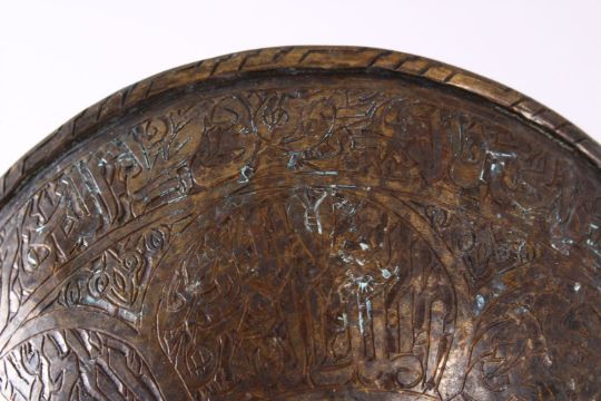 A 19TH CENTURY ISLAMIC CALLIGRAPHIC BRONZE MAGIC BOWL, with carved bands of calligraphy and interior roundel of calligraphy, central floral motif, 16.5cm