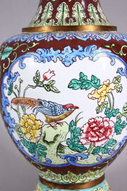 A GOOD 20TH CENTURY CHINESE ENAMEL VASE - ith a cafe au lait ground and panels of birds amongst flora, with lappet borders, 23cm high .