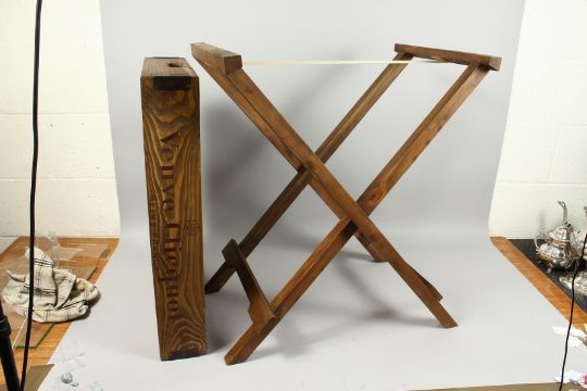 A PINE TRAY WITH FOLDING STAND, 'MOET CHANDON' TRAY.