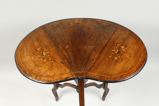A GOOD SMALL VICTORIAN DOUBLE FLAP CLOVER LEAF INLAID TABLE,with uniting stretcher.