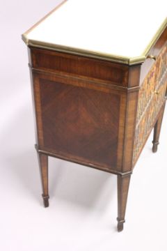 A GOOD 19TH CENTURY FRENCH RECTANGULAR TOP WITH MARBLE COMMODE, with a single drawer over book fronted double doors on tapering legs.