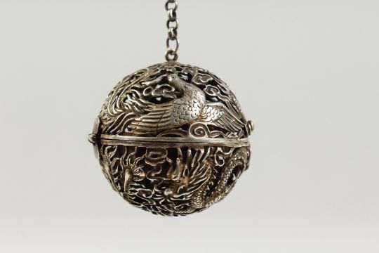 A CHINESE PIERCED BALL CENSER on a chain.