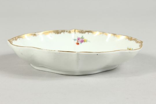 AN 18TH CENTURY MEISSEN PORCELAIN OVAL DISH edged in gilt and painted with a lady sleeping.