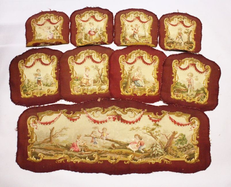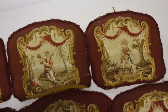 A SUITE OF FRENCH ABUSSON FABRIC from a settee and arm chairs,settee back piece, 5ft 6ins long, 2ft deep. Four chair backs 1ft 9ins x 1ft 10ins. Four chair seats, 1ft 5ins x 1ft 5ins.