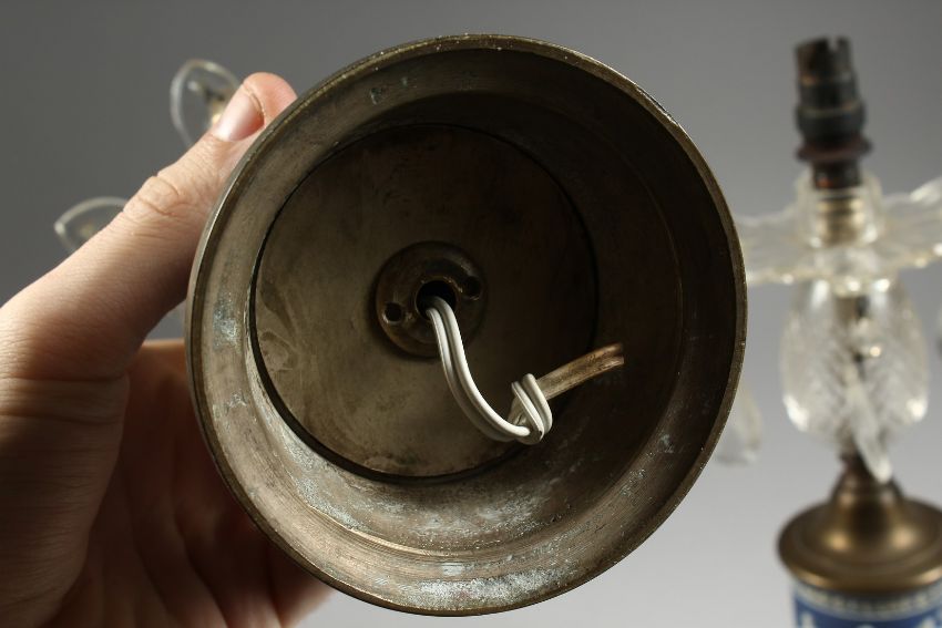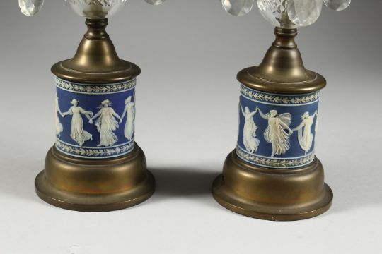 A GOOD PAIR OF WEDGWOOD BLUE AND WHITE LUSTRES with prism drops