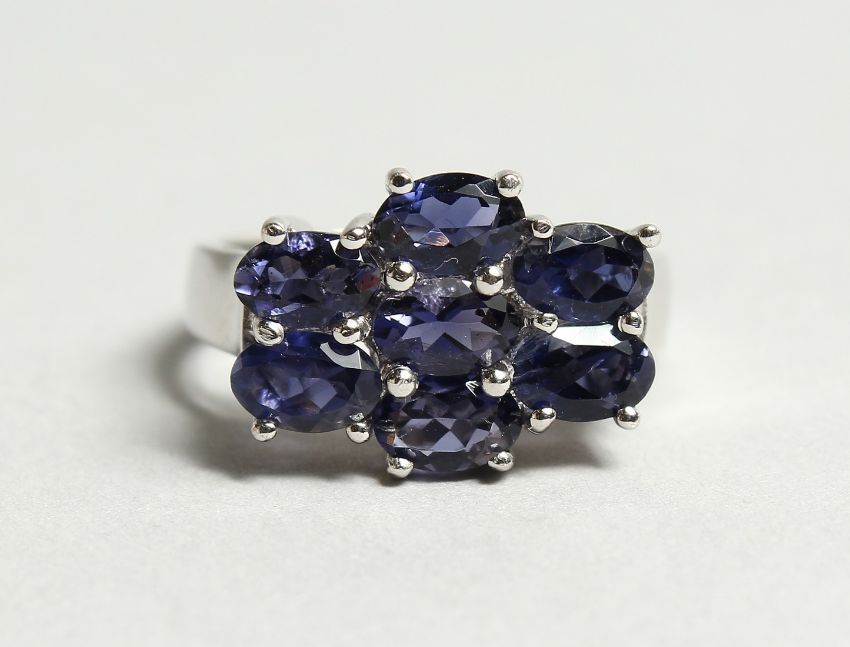 A SILVER AND SEVEN STONE SAPPHIRE RING