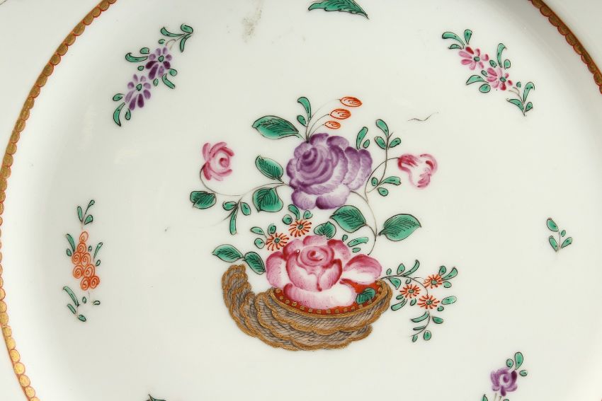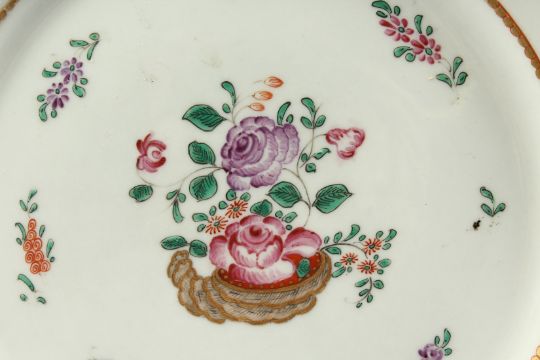 A PAIR OF SAMSON OF PARIS FAMILLE ROSE OCTAGONAL PLATES with roses. 9ins diameter