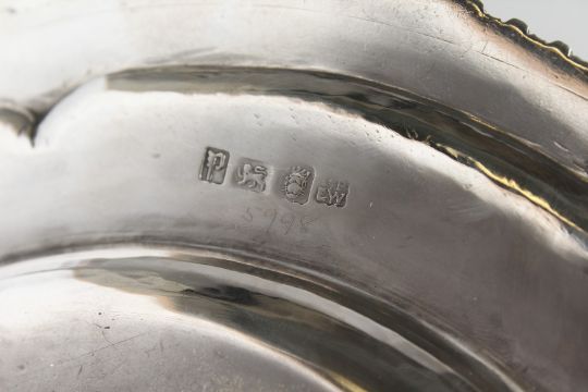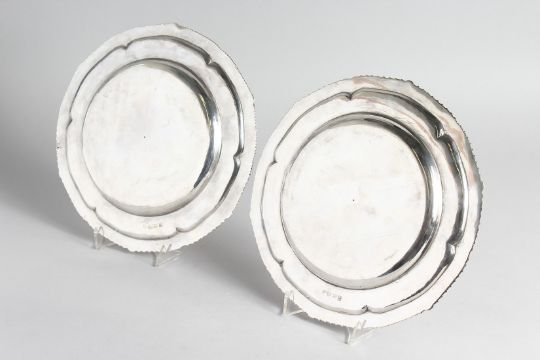 A PAIR OF GEORGE III CAST SILVER DINNER PLATES with gadrooned edges, 10 ins diameter, crested, London 1770, maker John Parker & Edward Wakelin. Weighs 44 ozs.
