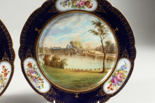 A SUPERB PAIR OF SEVRES PORCELAIN PLATES, the blue borders with vignettes of flowers, the centres painted with the Chateau De St. Germain and Chantilly.