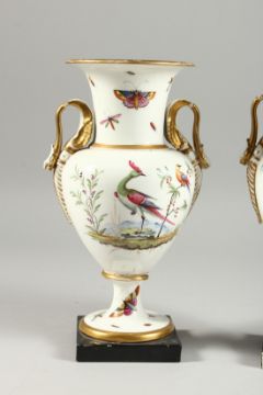 A GOOD PAIR OF FRENCH PORCELAIN TWO HANDLED VASES, painted with flowers, birds insects and butterflies