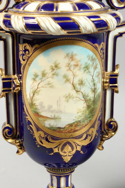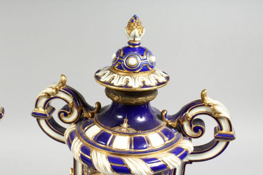 A SUPERB LARGE PAIR OF SEVRES TWO HANDLED VASES AND COVERS, rich blue and white ground edged in gilt with reverse oval panel by D. WATTAU, with young lovers and a lake scene.