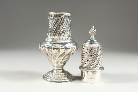 A VICTORIAN SUGAR SIFTER with repousse decoration.