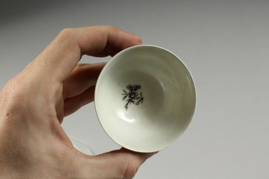 A WORCESTER TEABOWL AND SAUCER pencilled with the Boy on a Buffalo.