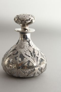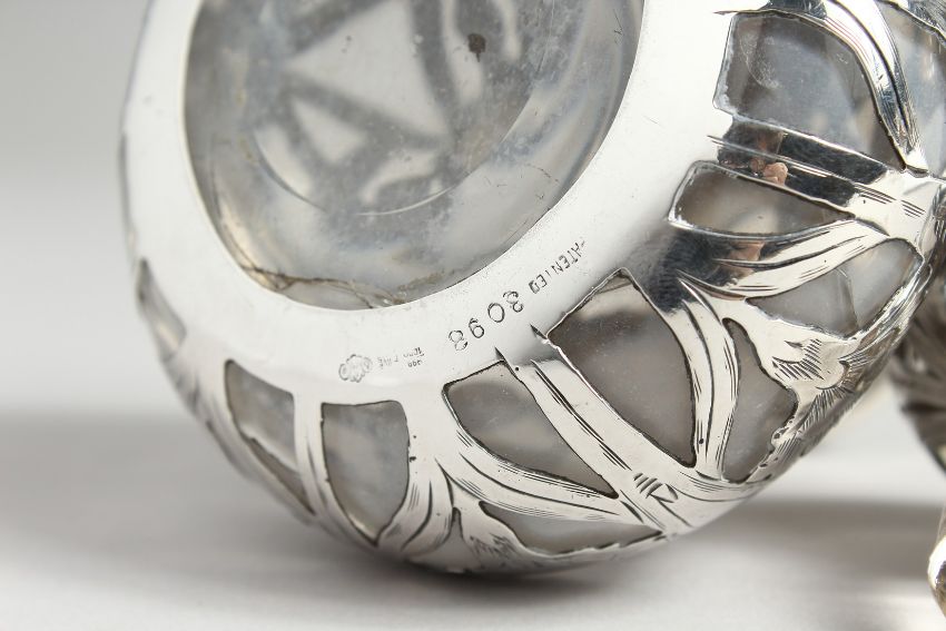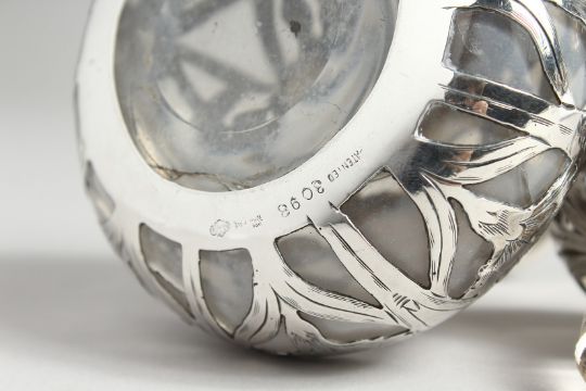 A GOOD SILVER OVERLAY SCENT BOTTLE AND STOPPER.