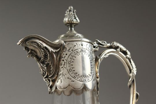 A VICTORIAN ETCHED GLASS CLARET JUG with plated mounts