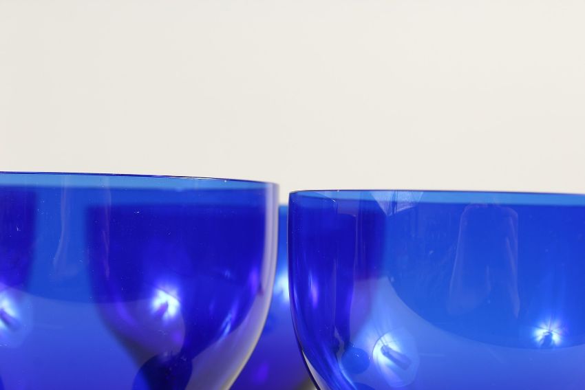 A BOX OF 6 WILLIAM YEOWARD LARGE BLUE WINE GLASSES
