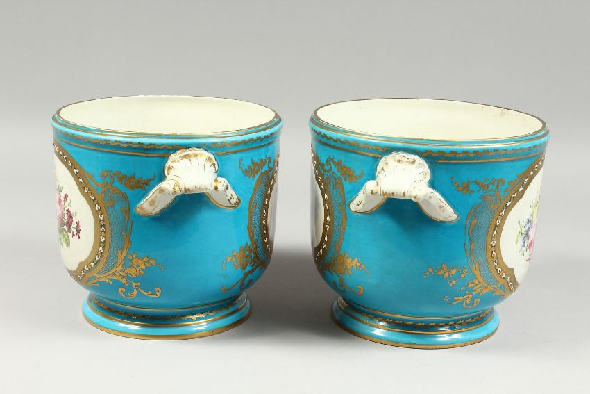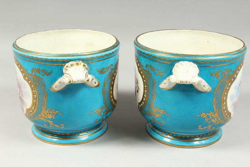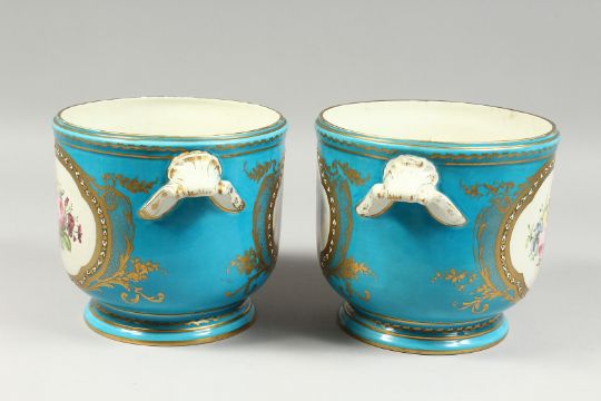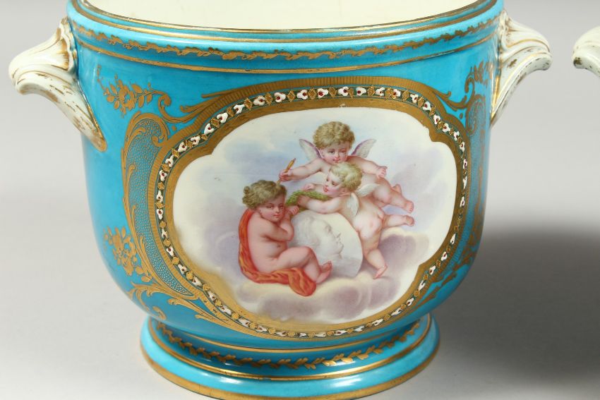 A LARGE PAIR OF SEVRES CIRCULAR BLUE GROUND COOLERS edged in gilt and painted with reverse panels of cupids and flowers.
