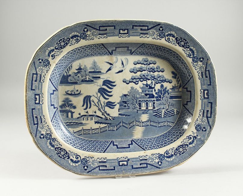 A WILLOW PATTERN BLUE AND WHITE DISH