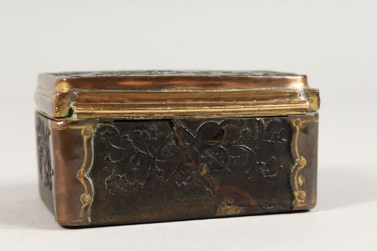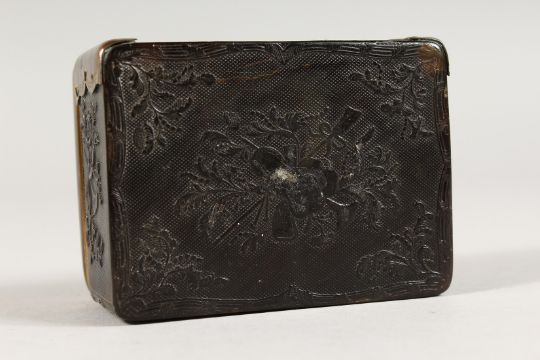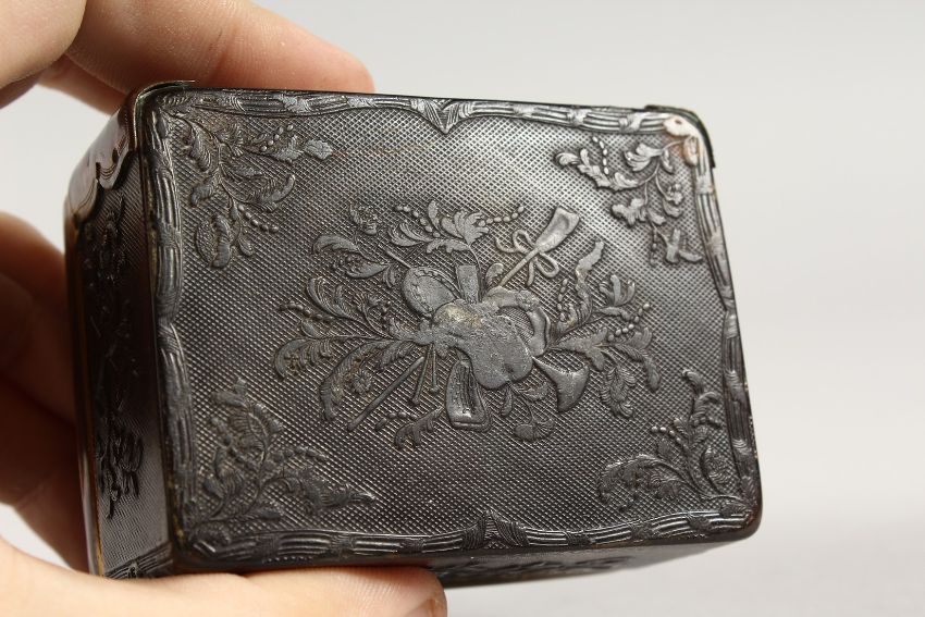AN 18TH CENTURY TORTOISESHELL BOX AND COVER with musical trophies in relief.