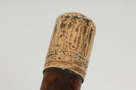 A LONG VICTORIAN TAPERING CEREMONIAL CANE with gilded handle and rope.