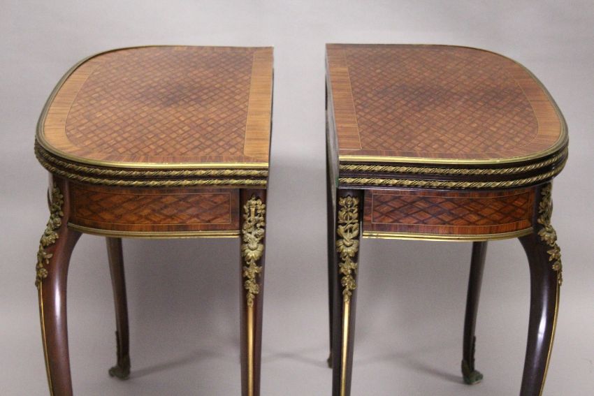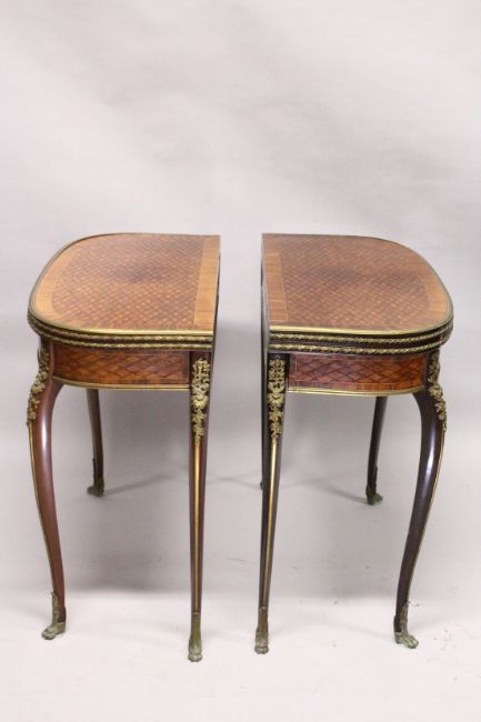 A SUPERB NEAR PAIR OF LINKE MODEL PARQUETRY CARD TABLES, with crossbanded folding tops, green baize interior, fine quality ormolu mounts on curving legs.