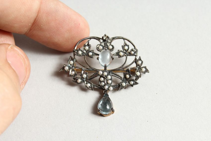 AN EDWARDIAN, 9CT. GOLD, DIAMOND, PEARL AND TOPAZ BROOCH