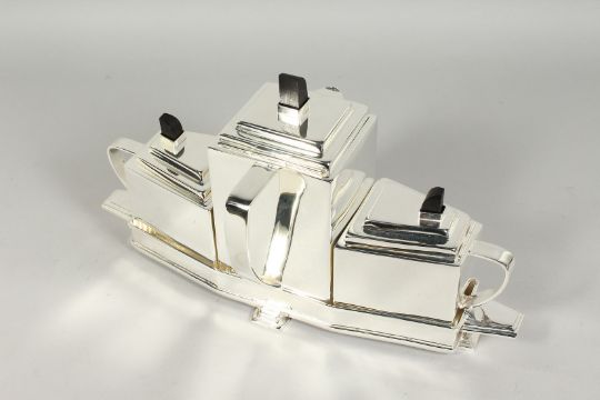 A CHRISTOPHER DRESSER DESIGN THREE PIECE PLATED TEA SET on a stand.