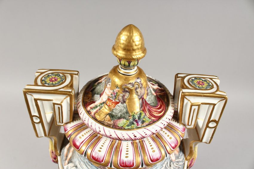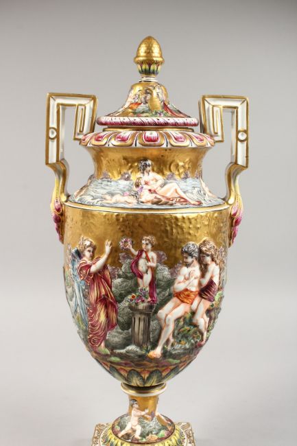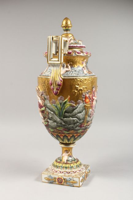 A SUPERB LARGE CAPODIMONTE TWO HANDLED URN SHAPE VASE AND COVER with gilt ground, with classical figures in relief.