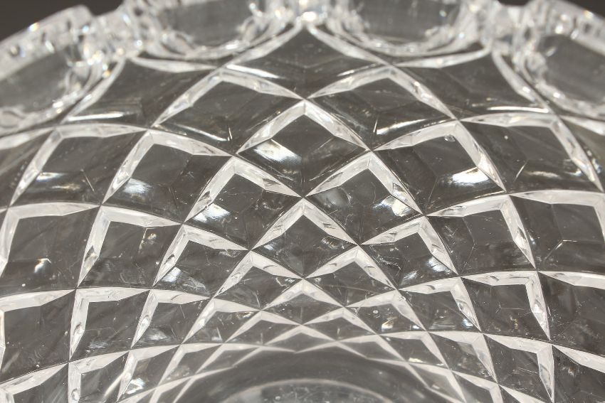 A LARGE WALSH SIGNED CUT GLASS PEDESTAL FRUIT BOWL,