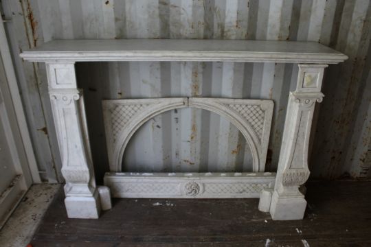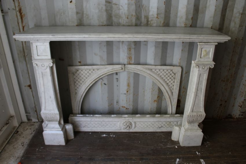 A GOOD CARVED MARBLE FIREPLACE, with broad mantle supported on a pair of classical columns, a carved frieze and lattice carved arches.
