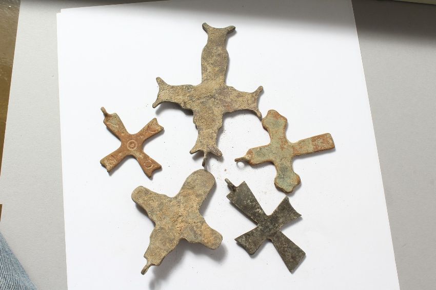 FIVE MEDIUM ROMAN IRON CROSSES.