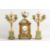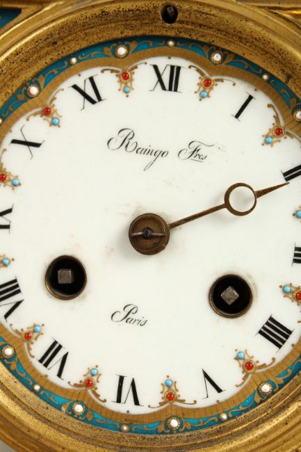 A SUPERB FRENCH 19TH CENTURY CLOCK GARNITURE by RAINGO FRES., PARIS, the clock striking on a single bell with urn finial and superb painted panels, 16ins high, complete with a pair of four branch candelabra, 16ins high.