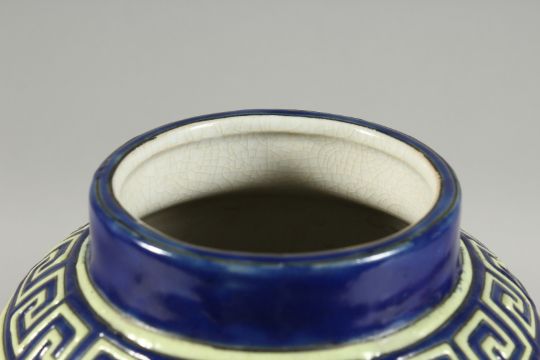 AN ART DECO DESIGN VASE with blue cats and key pattern.