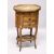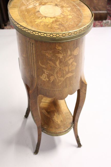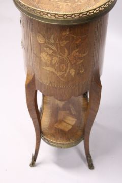 A GOOD 19TH CENTURY FRENCH OVAL THREE DRAWER COMMODE, with brass grill and marquetry inlay on curing legs and under tier.