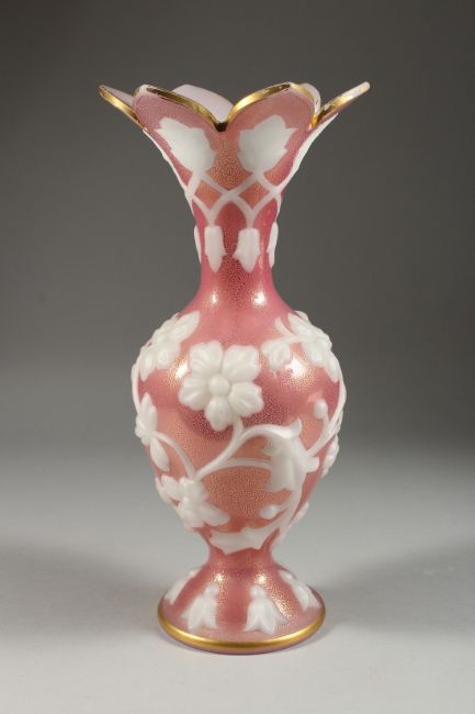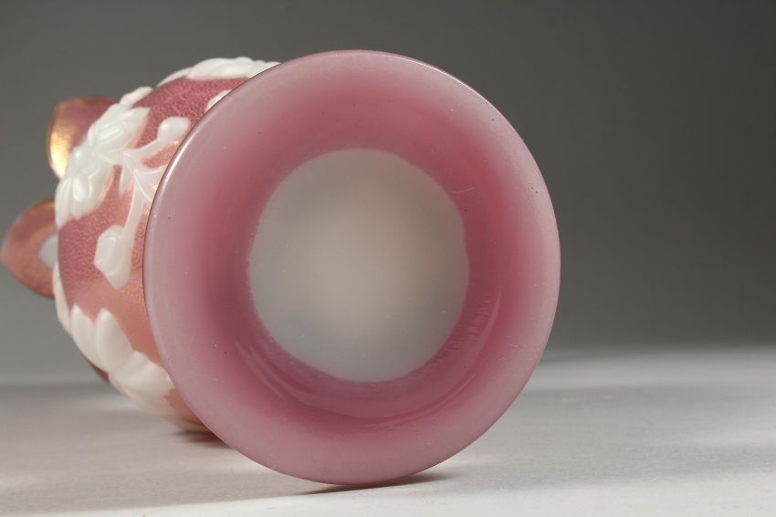 A GOOD BOHEMIAN PINK GLASS VASE, with pink flowers in relief.
