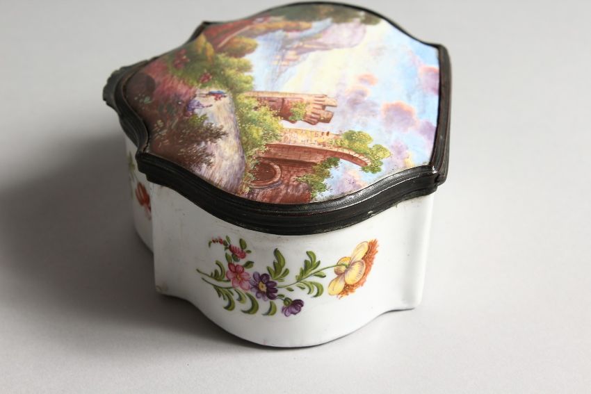 A LARGE ENAMEL BOX AND COVER the top painted with a lake, ruined castle and figure, the sides and inside lid with flowers.