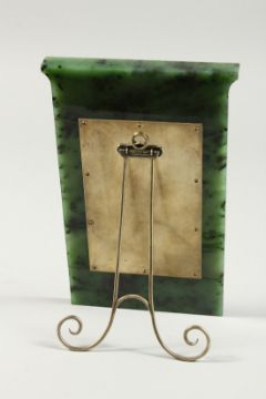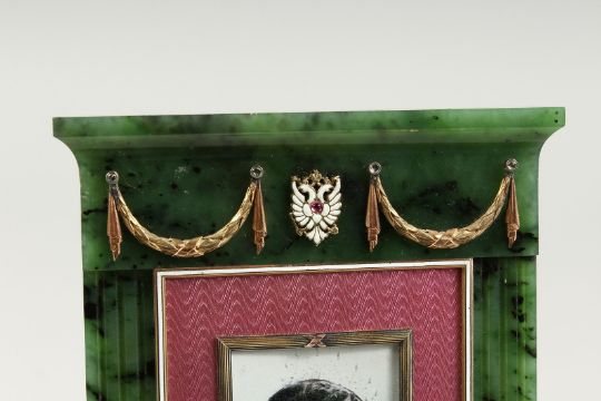 A SUPERB RUSSIAN JADE, GOLD AND ENAMEL MOUNTED PHOTOGRAPH FRAME with double eagle.
