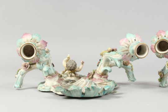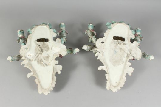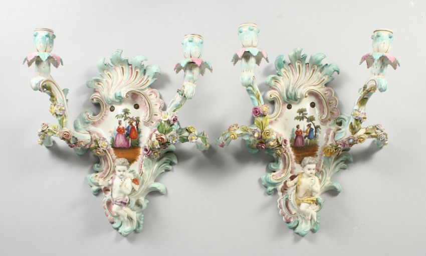 A GOOD PAIR OF MEISSEN PORCELAIN TWO LIGHT WALL SCONCES with cupid and encrusted with flowers and painted with figures in a garden sitting.