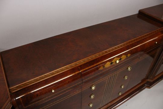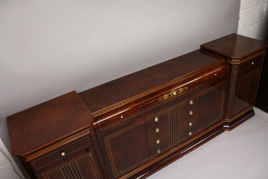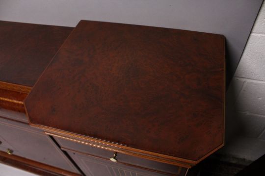 A SUPERB WALNUT INLAID SIDEBOARD AND SIDE PIECES BY DAVID LINLEY, fitted with a drawer and panel doors
