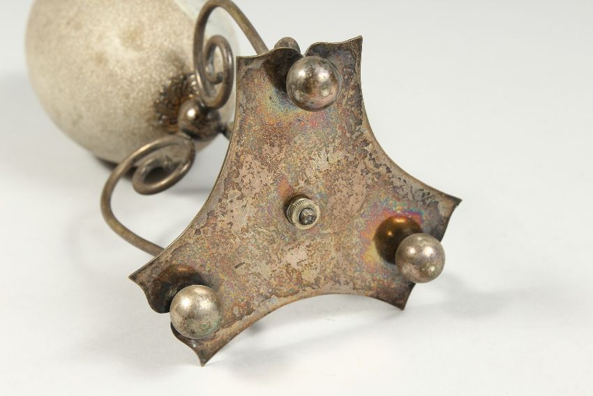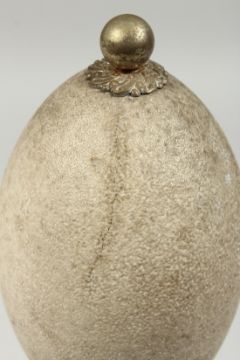 AN AUSTRALIAN EMU EGG with plated mount and wooden base, etched with an eagle.