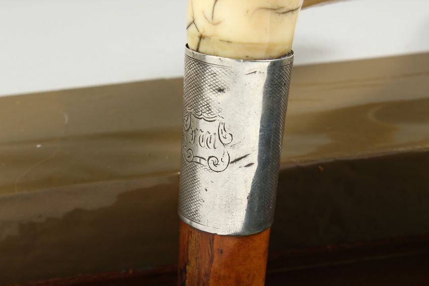A VICTORIAN BONE HANDLED WALKING STICK, with silver band.