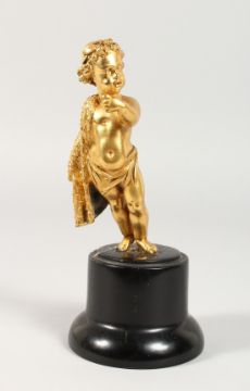 A 19TH CENTURY FRENCH ORMOLU PUTTI, on a wooden base.