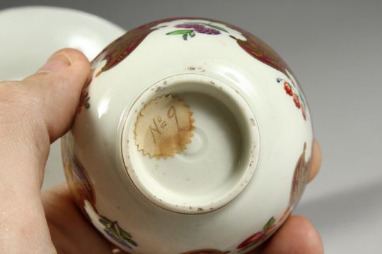 A WORCESTER TEABOWL AND SAUCER, painted with fruit on a claret ground, probably made as an addition to a Hope Edwars dessert service.