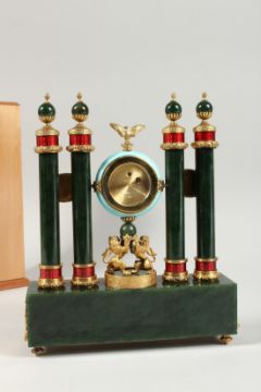 A SUPERB RUSSIAN SILVER AND JADE CLOCK TO COMMEMORATE 1613 TO 1913. Formed as four jade columns set with diamonds.