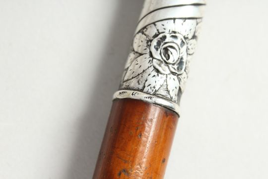 A VICTORIAN WALKING STICK with rhino crook handle and .800 silver band.
